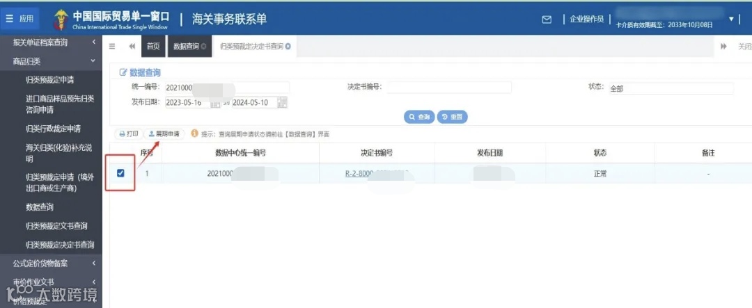 在《预裁定决定书》有效期截止前30-90日内,通过“单一窗口”的“海关事务联系单→商品归类→归类预裁定决定书查询”栏目提交展期申请。适用条件:申请主体及商品信息无变更,且文书未失效。