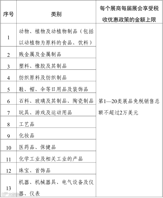 展期内销售的免税额度内进口展品免征进口关税、增值税和消费税,具体品类与额度详见附件。