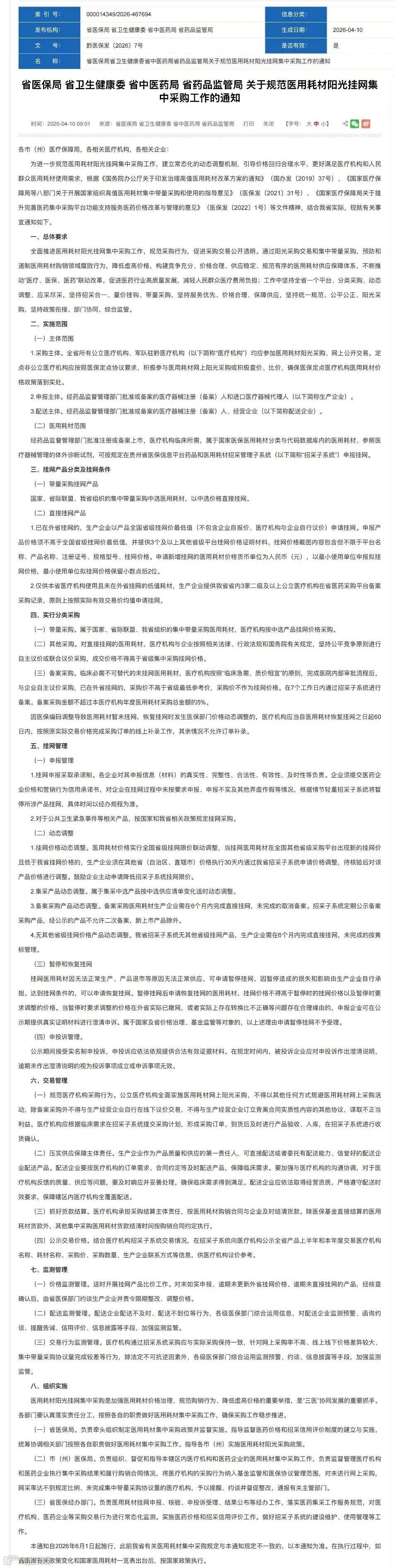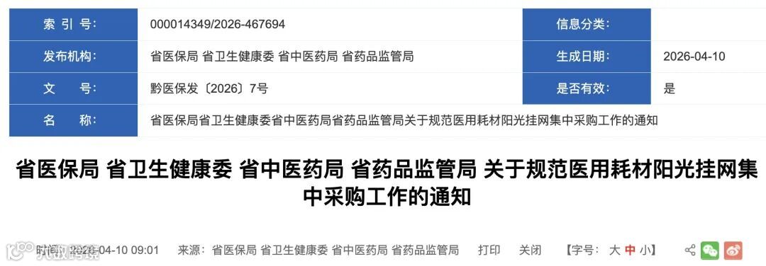 4月10日,贵州省医保局发布《关于规范医用耗材阳光挂网集中采购工作的通知》,将于2026年6月1日施行。