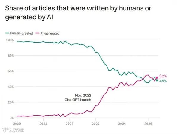互联网生态迎来关键转折点。网络研究机构Graphite最新调研显示,当前全球AI生成内容总量已正式超越人类原创内容,长期存在的行业隐忧正加速变为现实。