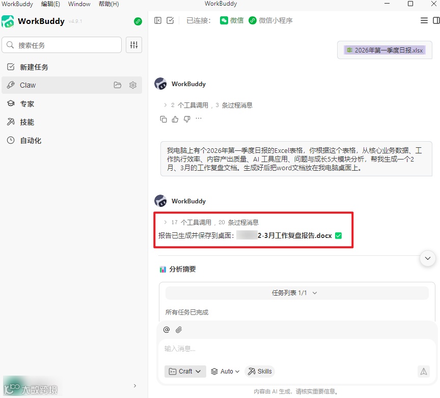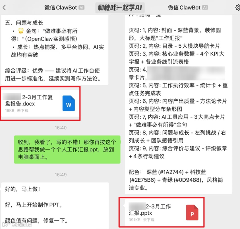 例如,某企业季度复盘工作中,用户将第一季度日报导出并通过微信发送给OpenClaw,数分钟内即收到完整复盘报告。用户进一步要求基于该报告生成汇报PPT,结果内容准确匹配文档要求,排版清晰、框架扎实,适用于临时汇报场景。