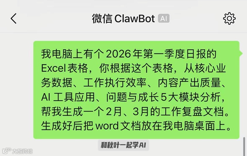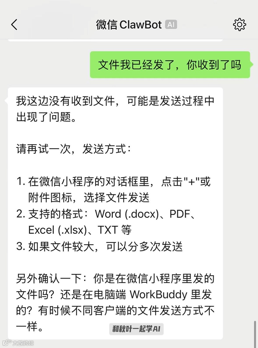 完成后,微信将弹出ClawBot聊天窗口,用于指令交互。