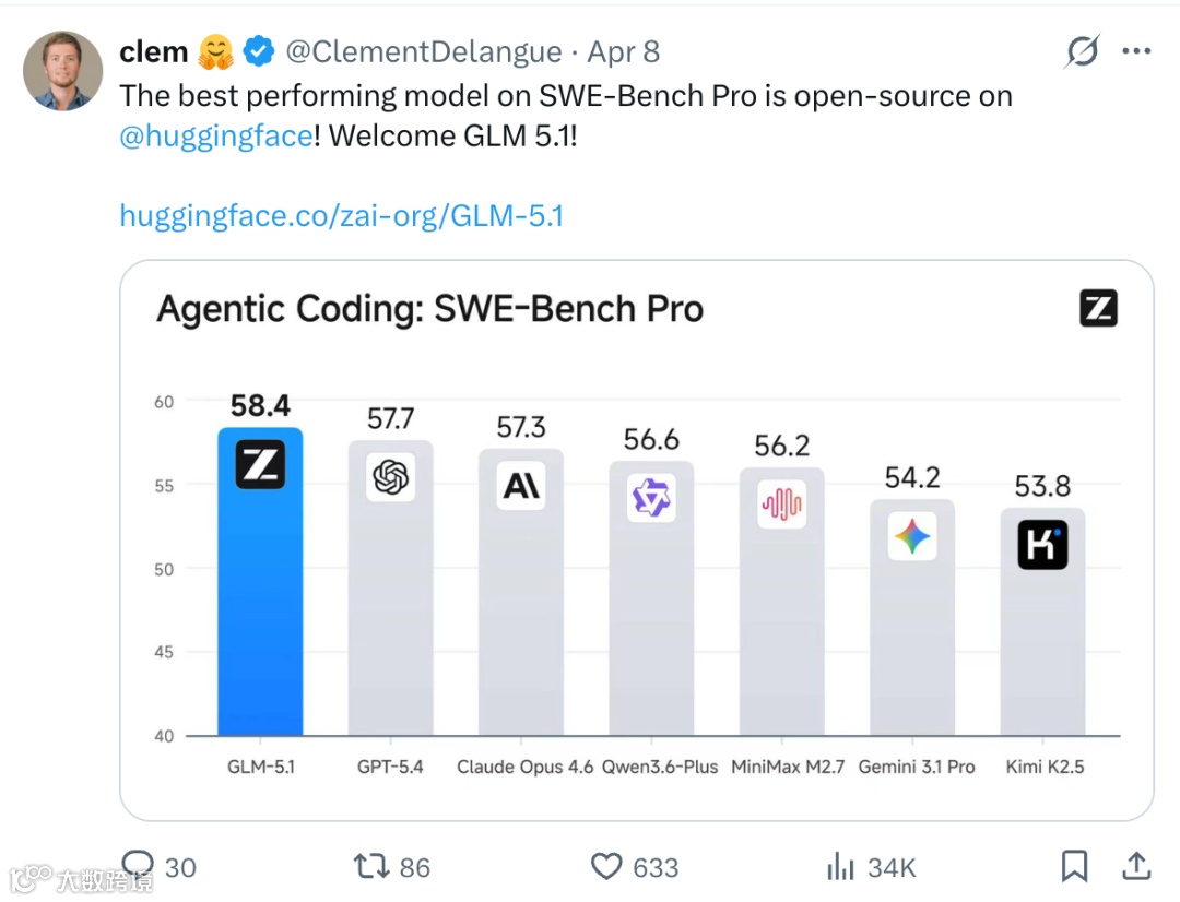 此前智谱于4月8日开源的GLM-5.1在SWE-BenchPro基准取得58.4分,超越Claude Opus 4.6及GPT-5.4(57.7分)、Gemini 3.1 Pro(54.2分)。该中国开源模型首次在Anthropic优势工程榜单实现反超。
