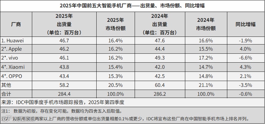 IDC数据显示,2025年中国智能手机市场总出货量约2.84亿台,同比微降0.6%。华为以4670万台出货量、16.4%市场份额重登榜首;苹果与vivo分别以16.2%市占比位列二、三位;小米与OPPO分列第四、第五位。