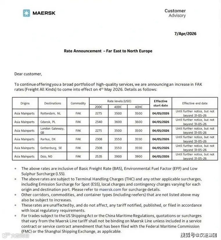 航运市场再掀波澜!全球物流巨头马士基正式宣布自2026年5月4日起上调亚洲-北欧航线FAK(各类货物费率),目标运价直指3500美元/FEU(40英尺高柜)。同时,苏伊士运河管理局(SCA)同步发布通告,4月7日起取消13万载重吨及以上、涵盖重箱、空船及双向通行的大型集装箱船15%的过路费折扣。两大重磅调整叠加,欧洲航线海运成本将全面攀升。