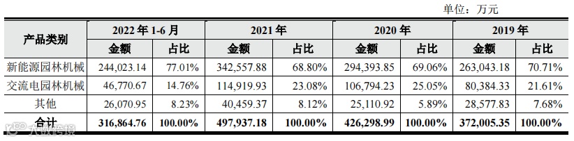 格力博产品按动力类型可分为新能源园林机械和交流电园林机械,其中以新能源园林机械为主,收入占比约 70%。新能源园林机械覆盖手持式、手推式、坐骑式和智能式全系列产品,主要包括割草机、打草机、吹风机、修枝机、链锯、智能割草机器人、智能坐骑式割草车及配套的电池包;交流电园林机械主要为清洗机、割草机,其他产品主要为空压机、电动工具和配件等。