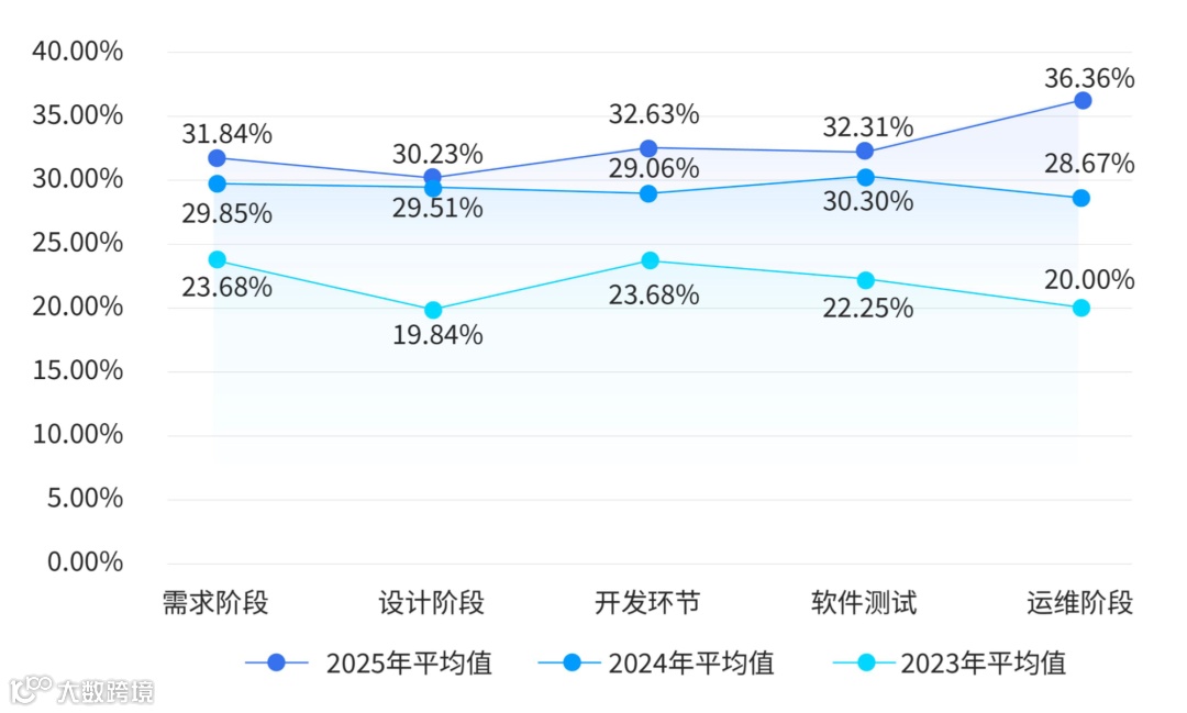 2. AI技术为软件工程带来了整体性的效率提升。受访企业软件研发全生命周期的效率提升呈现出显著变化,其中开发环节较为明显,从2024年的29.06%提升至32.63%,运维环节最为明显,由28.67%大幅跃升至36.36%,需求、设计和测试环节亦有不同程度提升。