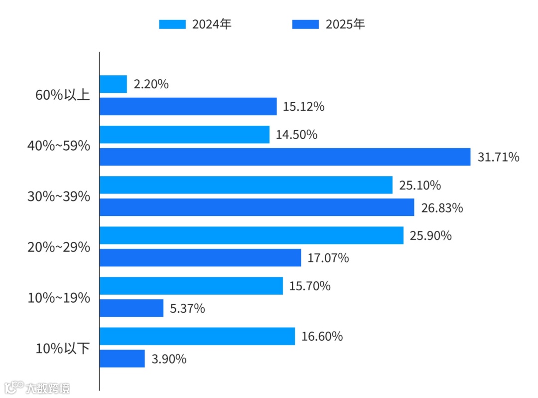 4. 企业平均AI生成代码采纳率同比提升超50%。通过智能开发工具生成的代码量呈现显著提升的趋势,代码生成采纳率2025年平均值为42.61%,同比提升55.17%,其中采纳率超过40%的企业占比接近40%。数据表明,由于智能开发工具的用户满意度逐步提升,使用频率大幅提高,生成的代码采纳程度也随之增加。