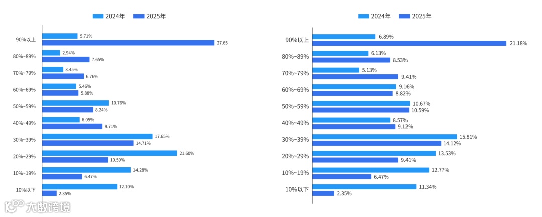 3. 近30%的企业智能开发工具应用渗透率超过90%。从2024到2025年,受访企业内部应用智能开发工具的开发人员占比向高比例区间大幅跃升。2025年,几乎所有开发人员(90%以上)均应用了智能开发工具的企业占比从5.71%大幅增长至27.65%,且具备90%以上活跃用户占比的企业提升到21.18%。根据数据表明,超半数企业实现了开发团队的大规模覆盖,整体渗透水平已从早期的局部试点阶段迈入了广泛普及的新阶段,且智能开发工具已从“可用”向“好用”逐渐转变,并成为软件开发人员日常工作中不可或缺的工具。