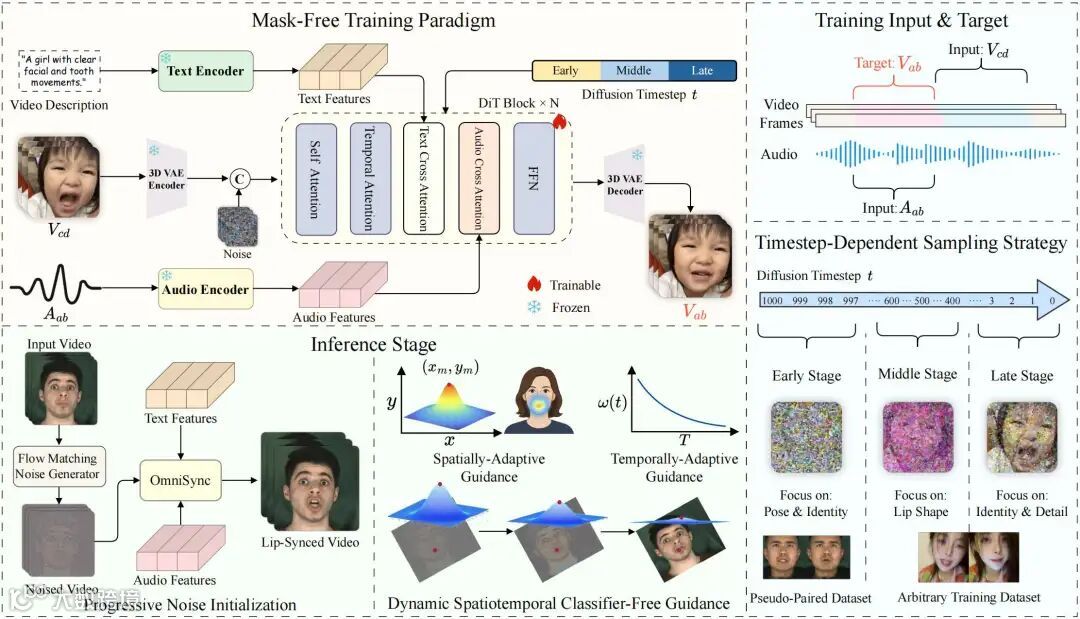 OmniSync 框架概述。一种无掩码训练范式采用时间步相关的采样来预测唇部同步目标Vab。在推理过程中,渐进式噪声初始化和动态时空CFG确保一致的头部姿态和精确的唇部同步。