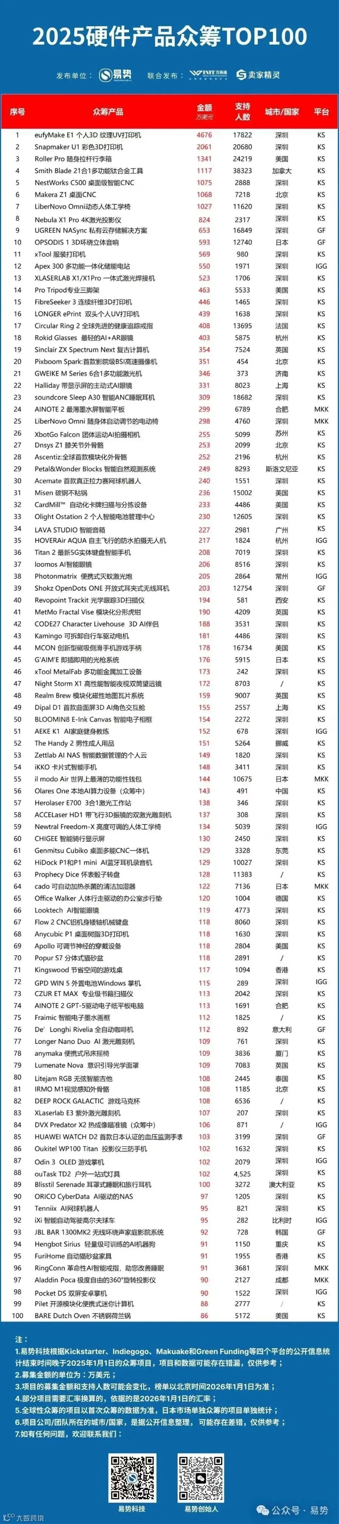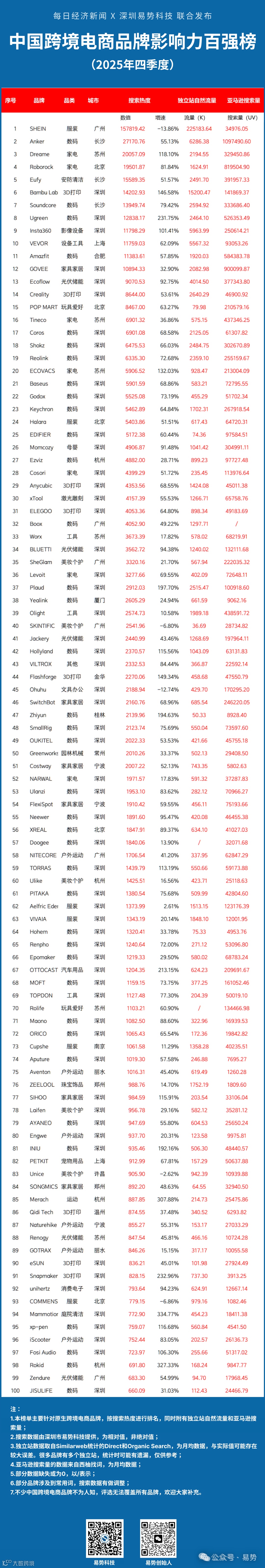 近日,《每日经济新闻》联合深圳易势科技发布“中国跨境电商品牌影响力百强榜(2025年Q4)”,同时易势科技也公布了“2025硬件产品众筹TOP100”。两份榜单叠加,中国出海品牌的真实战力一目了然。