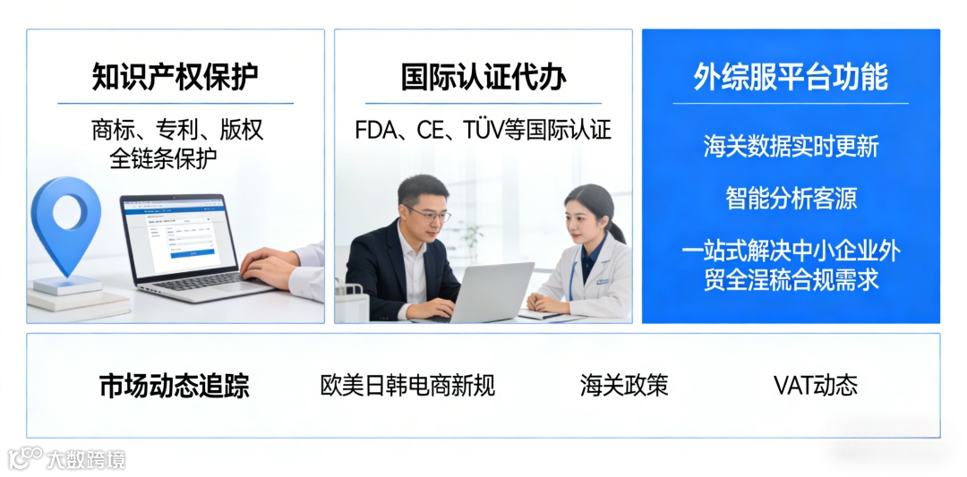 文件明确鼓励企业海外注册商标、申请专利,建设合规出海服务平台。兰华跨境提供知识产权保护与国际认证代办服务,依托外综服平台解决中小企业外贸全流程合规需求,并同步追踪欧美日韩电商新规、海关政策及VAT动态。