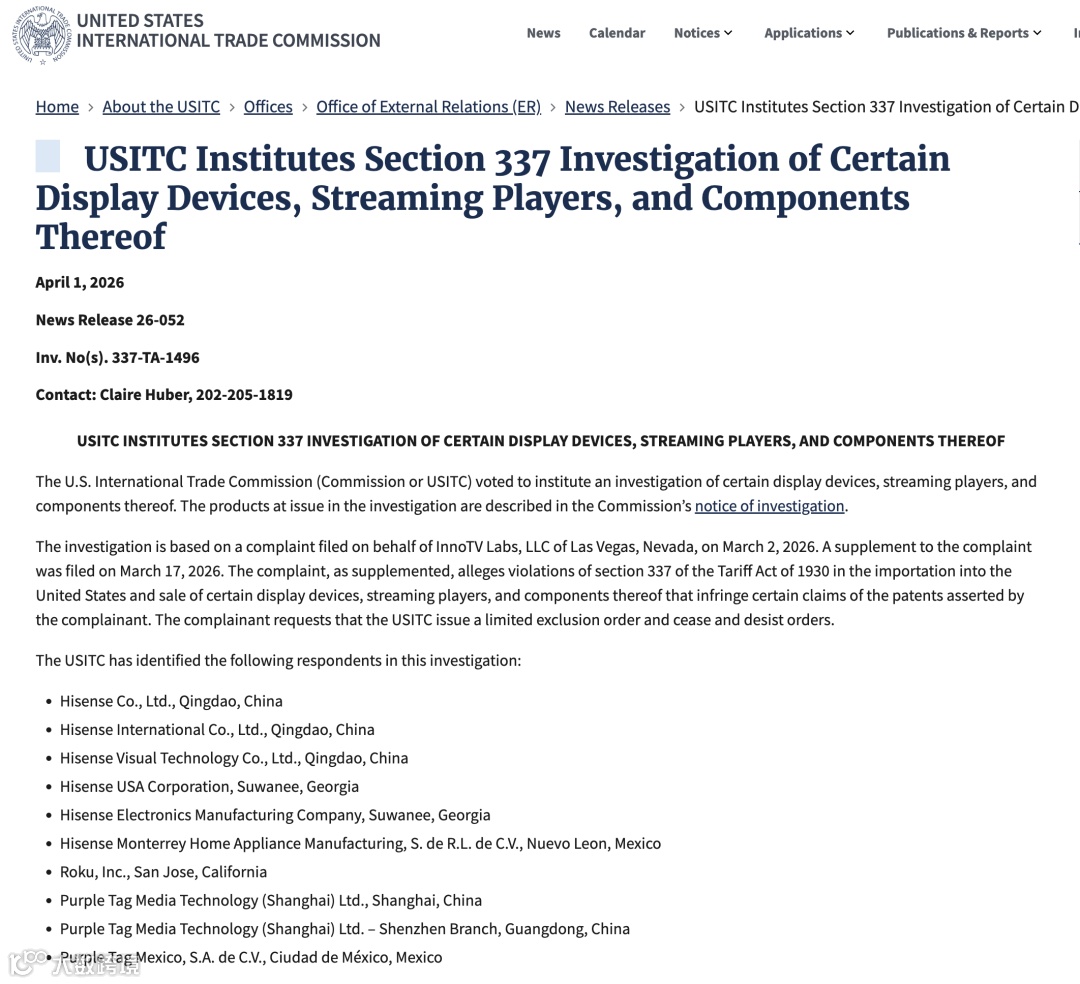 近日,美国国际贸易委员会(USITC)接连对中国出口的智能显示设备及流媒体电子产品发起两起"337调查",TCL、海信等多家企业被纳入调查范围,涉及智能电视、显示器及相关核心组件。此次密集立案凸显美国对中国电子制造企业的知识产权审查趋严,标志着高附加值消费电子产品的专利博弈已成为中国品牌出海的关键挑战。