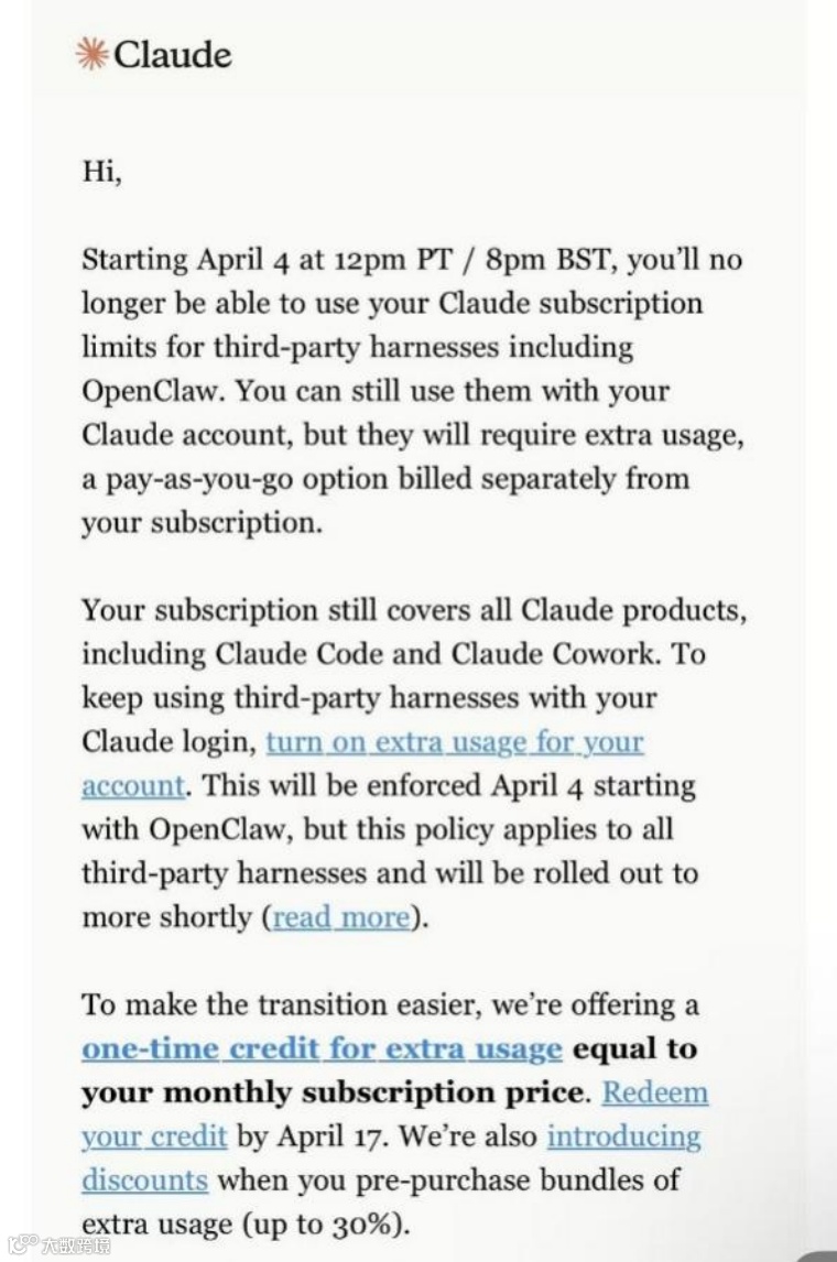 Anthropic于4月4日宣布,Claude Pro和Max订阅将不再覆盖OpenClaw等第三方工具。用户仅获等额月费补贴,远不及此前200美元无限调用的优惠,引发社交媒体强烈反弹。