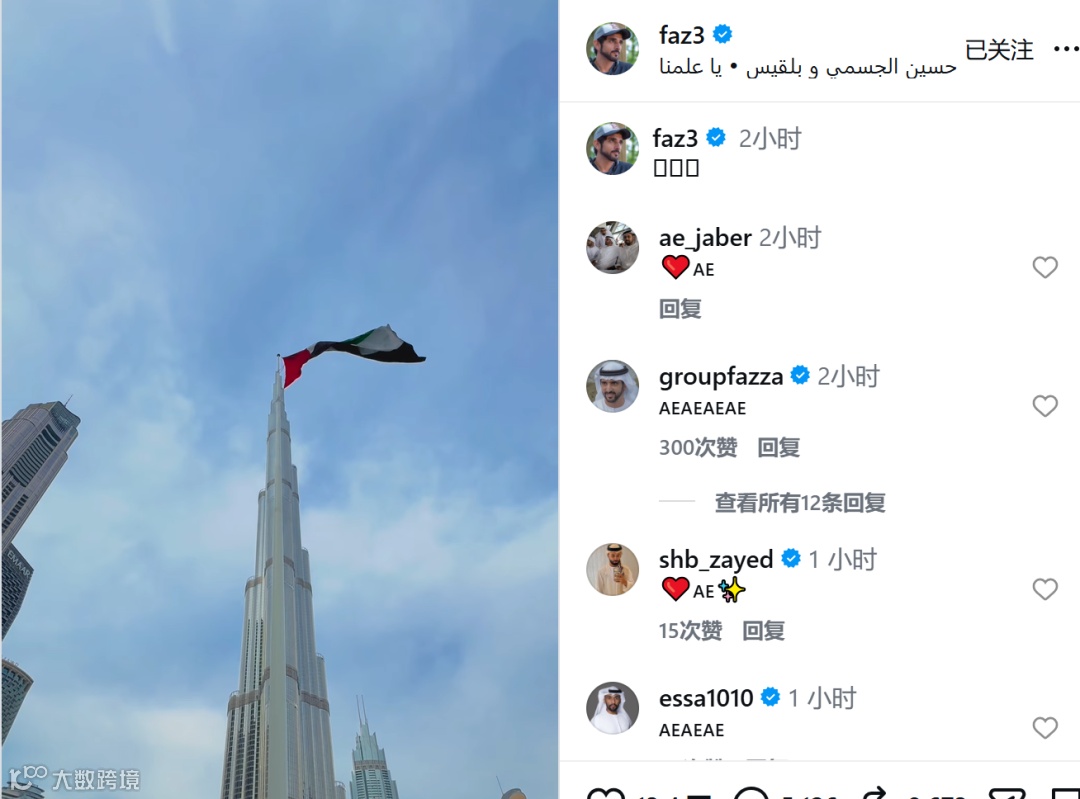 视频在Instagram发布后迅速引发广泛传播。此前,迪拜酋长谢赫穆罕默德·本·拉希德已呼吁全国民众将国旗"飘扬在每个家庭和建筑之上",强调其作为国家自豪感与凝聚力的象征意义。
