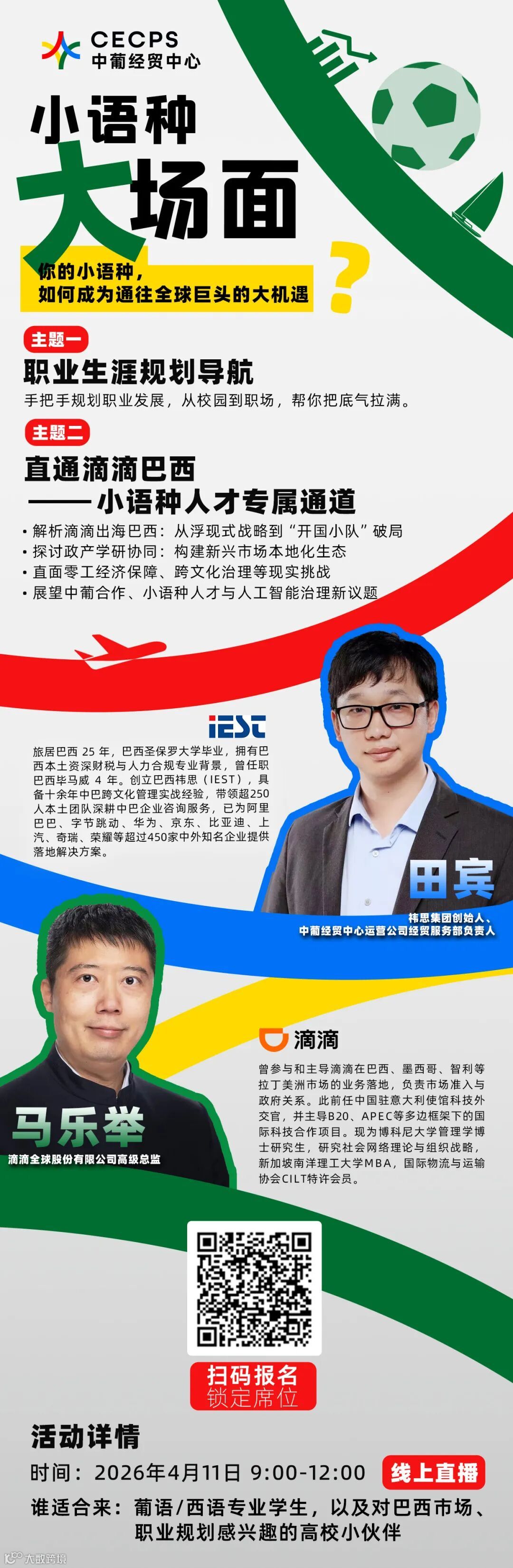 4月11日,中葡经贸中心联合资深出海专家田宾与滴滴全球高级总监马乐举,举办线上分享会。聚焦葡语/西语学生职业发展,围绕校园到职场的路径规划、滴滴巴西市场破局实战、政产学研协同构建本地化生态等核心议题,提供系统性解决方案。特邀旅居巴西25年的专家分享跨文化管理实战经验。