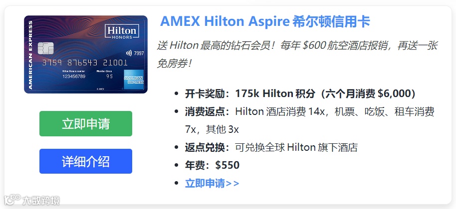 - Hilton Aspire卡:持卡即赠Diamond会籍