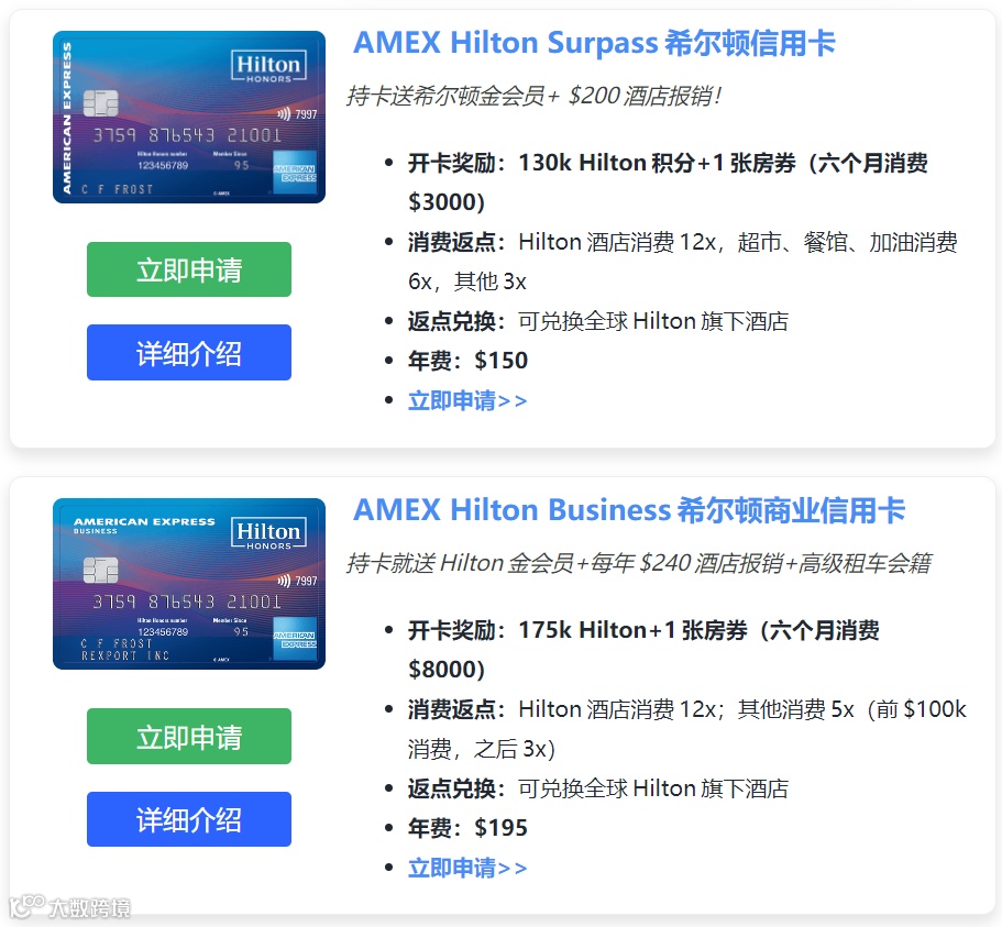 - Hilton Surpass卡:消费满4万美元升级Diamond