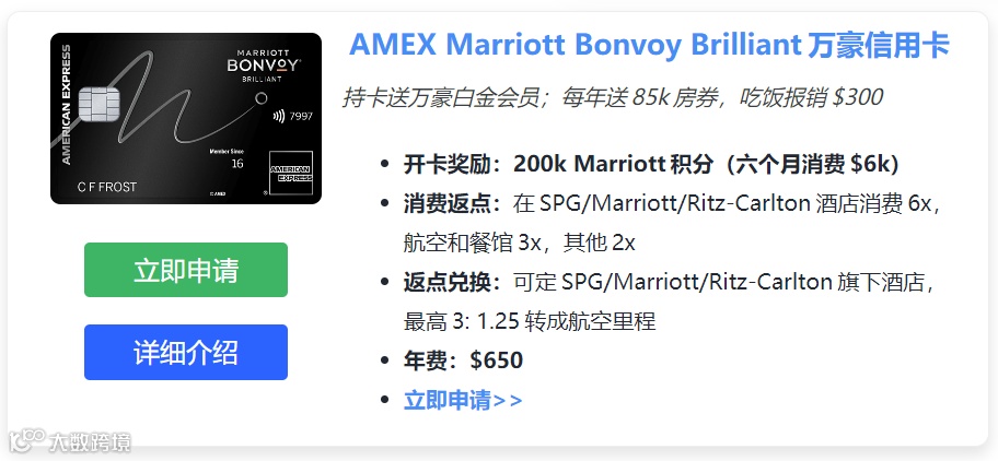 - Marriott Brilliant卡:持卡即赠白金会籍(50晚级别)