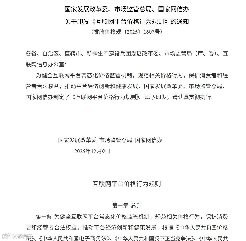 国家发展改革委、市场监管总局、国家网信办关于印发《互联网平台价格行为规则》的通知(发改价格规〔2025〕1607号)