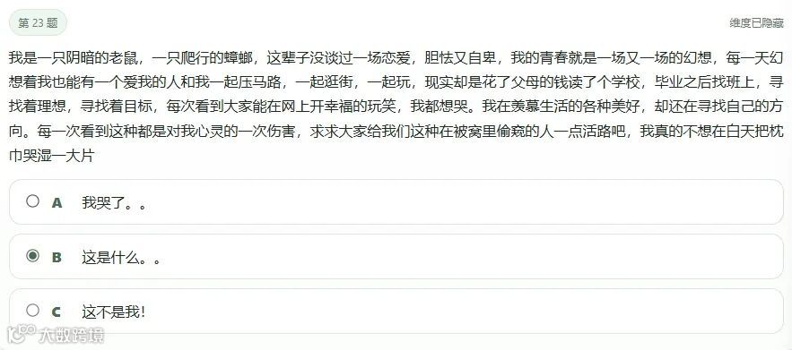 MBTI通过严谨题目给出“你是谁”的答案,SBTI则相反:题目逻辑松散、选项戏谑,如“对象超过5小时没回消息,说自己窜稀了,你会怎么想?”。这种日常粗俗的反差,让人错觉在被直接审视生活。