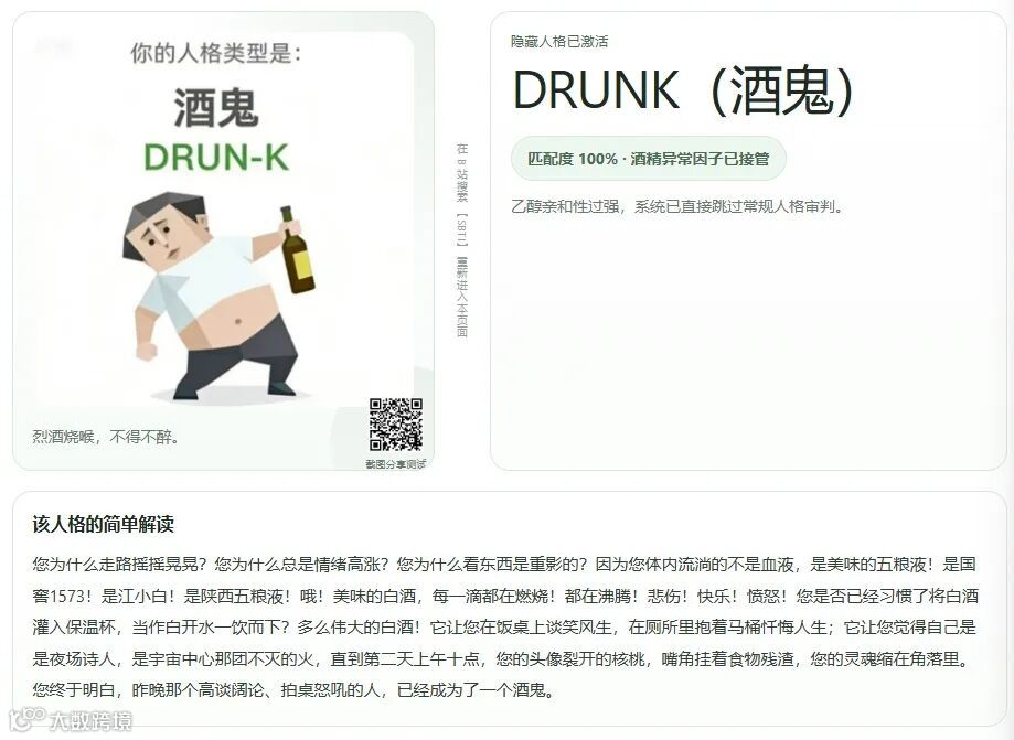 测试中,朋友边饮酒边参与,质疑链接真实性。但若选饮酒相关爱好,将触发补充题,最终得出量身定制的结果。它已非测试,而是“带结论的提问”。
