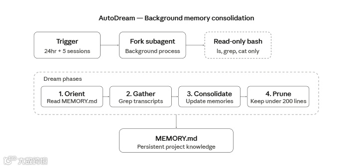 Claude Code 会在后台派生一个代理,回顾你过去的会话,并把它学到的内容整合进内存文件。