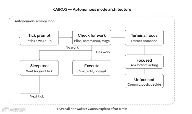 每个 tick 就像一次唤醒。Claude Code 会周期性接收这些提示,寻找可做的有用工作,然后采取行动或继续休眠。