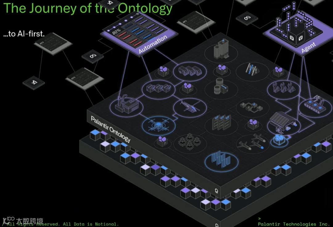 随着大型语言模型(LLM)的爆发,本体系统演进到了智能化自动化的新纪元。如今,大模型被深度集成到本体中,开始将前一阶段积累的业务动力学逻辑进行“机械化”与“自动化”。AI 智能体可以直接调用本体中的动作与函数,实现复杂业务流的自主驱动。