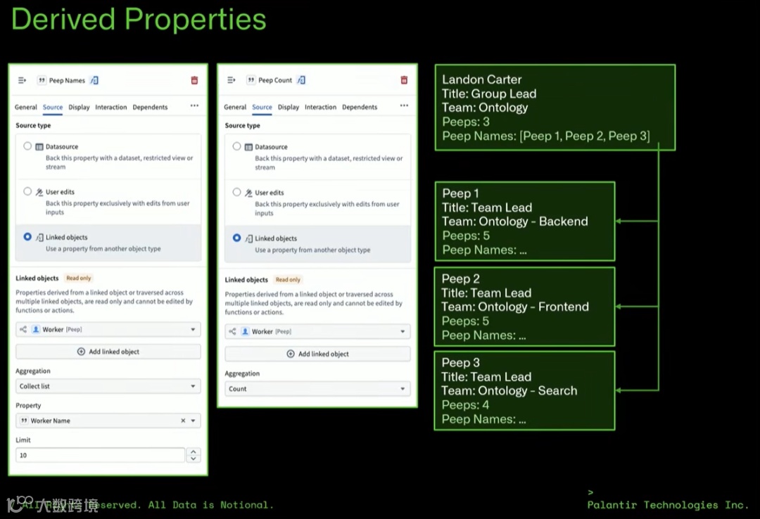 派生属性的破局:派生属性允许底层数据保持高度的范式化。数据依旧乖乖待在原本的员工对象里。开发者在本体层面定义语义业务逻辑(例如:“沿着 lead_peep 关系链遍历,聚合所有关联员工的姓名并计数”)。这一机制不仅避免了数据的冗余存储,更将“业务逻辑层”彻底从“数据物理层”剥离,是领域驱动设计(DDD)在本体构建中的巅峰体现。
