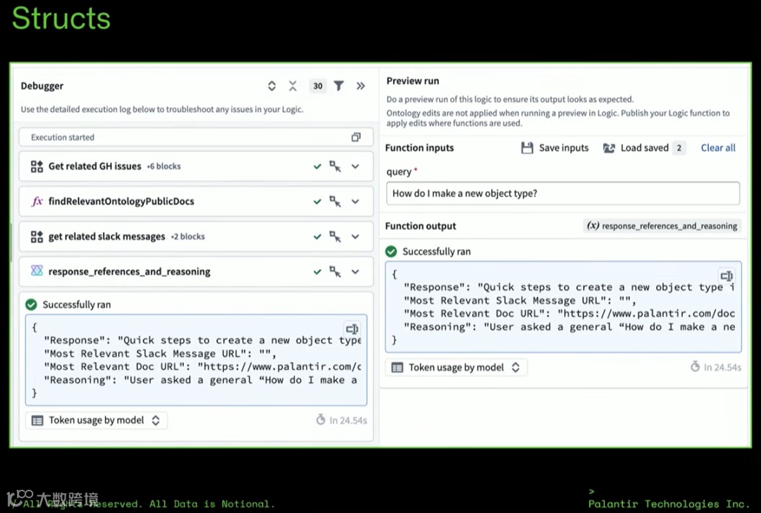 结构体的作用:早在 Gotham 时代的动态本体管理器(POM)中,Palantir 就确立了将这些关联信息打包为单个 Struct 属性的范式。现在 Foundry/AIP 也全面支持这一特性。特别是在大模型场景下,例如集成在 Slack 中的智能问答机器人,本体不仅需要记录 LLM 的最终回答,还需要将“引用的文档 URL”、“相关历史消息”以及“LLM内部的推理链路”打包为结构体存储,以供后续的合规审计和质量分析。