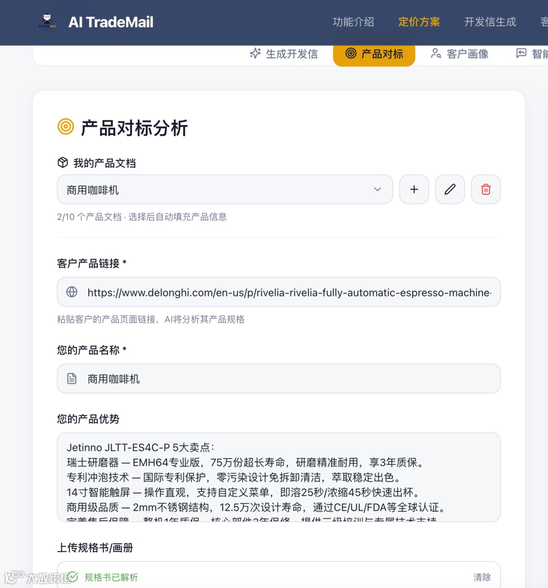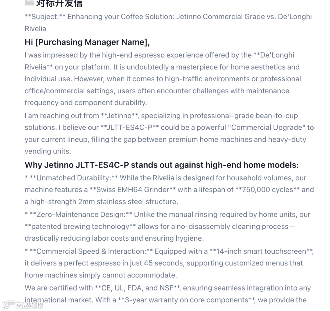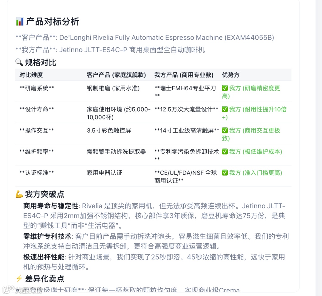 1. 对标策略精准 选择 De'Longhi Rivelia 作为对标对象非常聪明——它是知名高端家用机,与 Jetinno 商用定位形成天然区隔。不是"我们比你好",而是"我们适合不同场景"。