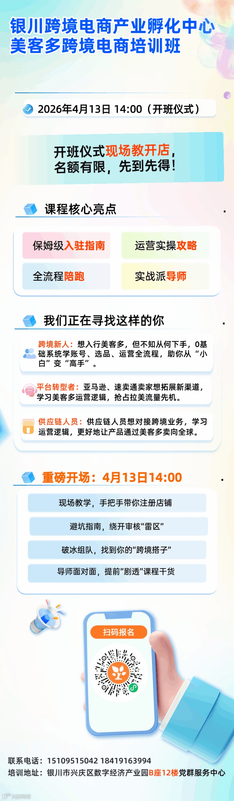 4月13日14:00银川跨境电商产业孵化中心首期美客多跨境电商培训班将正式开课。报名仅剩最后2天