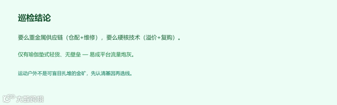 总结: 通过这轮短巡检与剖析,我们不难发现:运动户外不是一个可以盲目扎堆的金矿。你要么去啃那些最难啃的骨头——做极重的供应链(拼本地化售后和底仓仓储运作);要么去卷最硬核的技术(拼三电科技与产品独占性)。如果什么资产(无论是重资产还是技术资产)都没有沉淀,只想拿点瑜伽垫或弹力带去碰碰运气,在今天的红海竞争和平台规则下,大概率只能沦为算法机器里的流量炮灰。