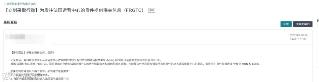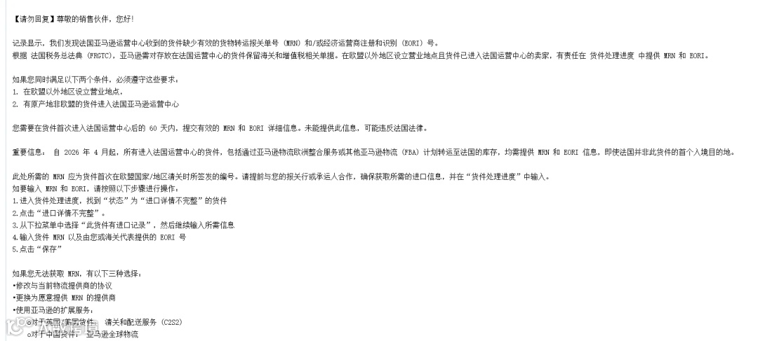 自2026年4月1日起,亚马逊法国站将对FBA货件实施海关合规新规,要求向法国运营中心发货的卖家提供MRN(货物转运报关单号)与EORI(经济运营商注册和识别号)。此举旨在满足法国海关对货件清关及增值税记录的监管要求,卖家须及时完成信息提交。