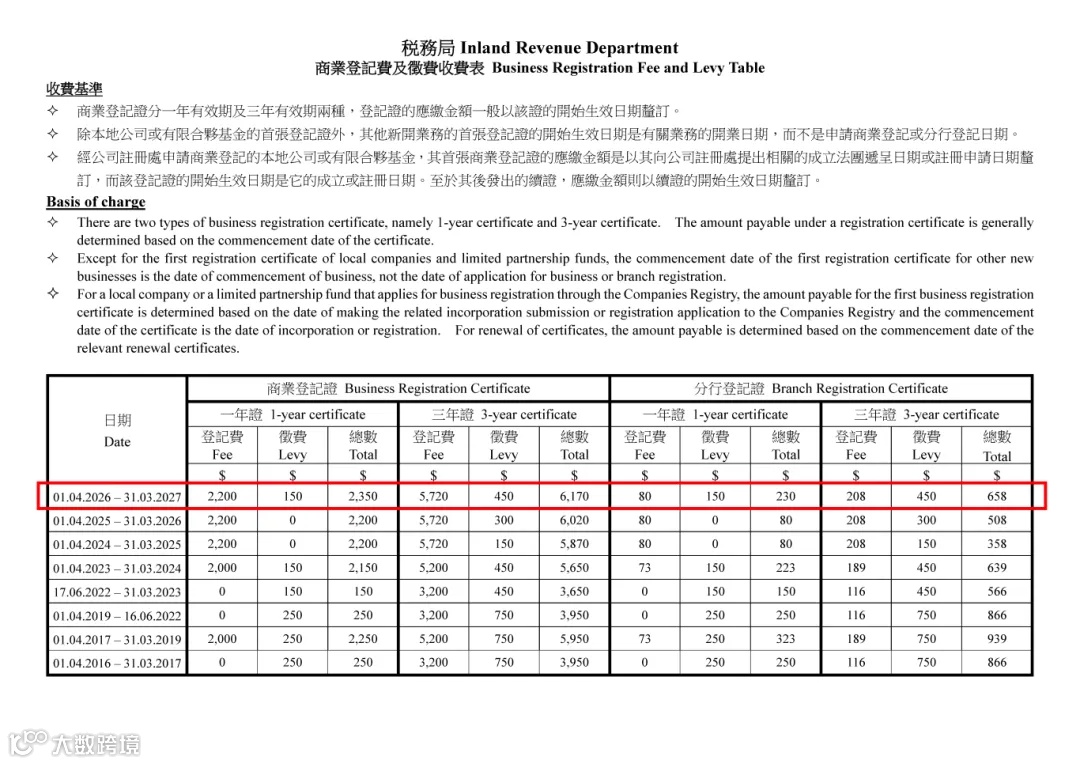 香港2026/2027年度财政预算新规于4月1日正式生效,为期两年的商业登记征费宽免政策结束。新规将恢复征收每年150港元的商业登记征费(专项用于破产欠薪保障基金),导致一年期商业登记证总费用由2200港元上调至2350港元,三年期费用同步增加450港元。所有4月1日及之后生效的商业登记证(含新注册及续证)均按新标准执行。