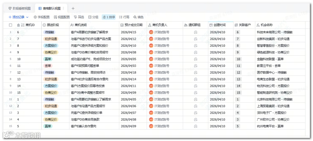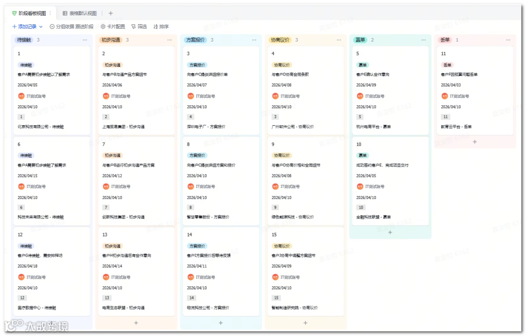 明确客户字段:个人客户需姓名/手机/来源;企业客户需公司名/对接人/行业/规模。精简必要字段,避免信息过载。 - 设定商机阶段:如待接触→方案报价→议价→赢单/丢单,按业务特性自定义流程(如教培:试听→报名→续费→转介绍)。