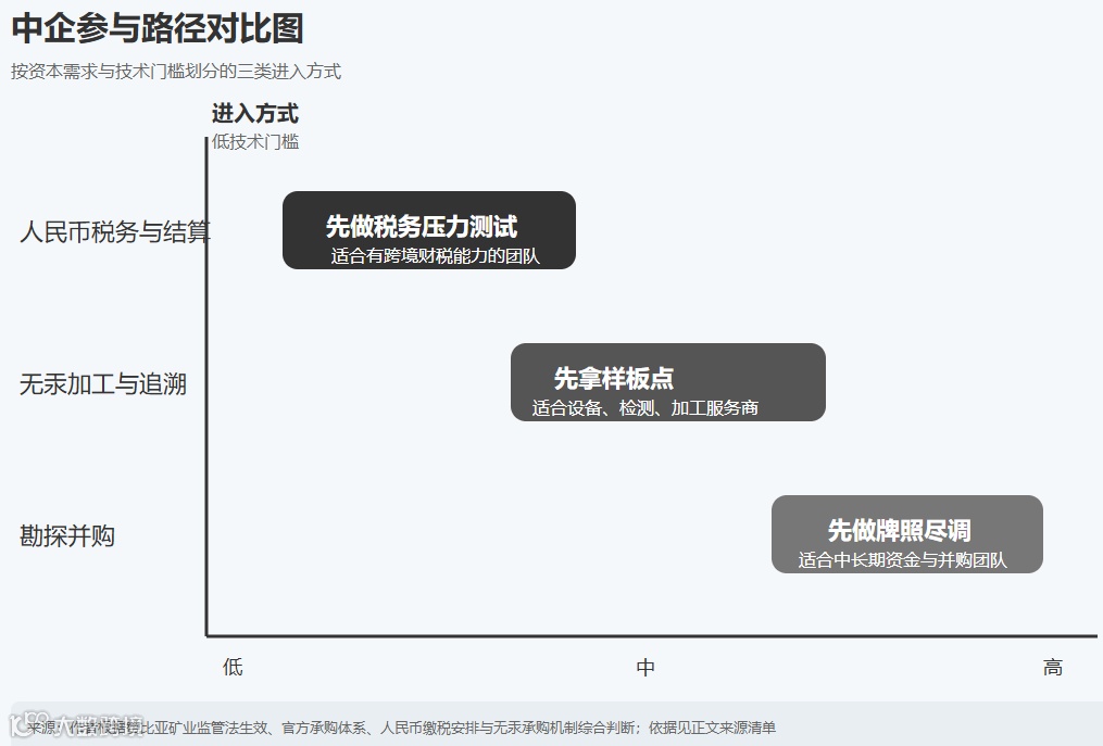 尽管交易机制、人民币缴税及国家承购体系已成形,但采购规模、溢价机制及审批效率等执行细节仍存不确定性。这些执行落差恰是先行者与后入者的核心分界线:待流程完全透明时,矿权溢价、服务成本及关系门槛将显著抬升。