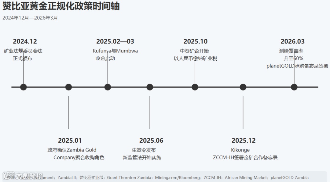2024年12月通过的《矿业监管法》于2025年6月正式实施;截至2026年3月,全国高分辨率航空地球物理测绘覆盖国土60%;中资矿企自2025年10月起启用人民币缴纳矿业税;Zambia Gold Company已在Rufunsa和Mumbwa启动手工金矿收购。