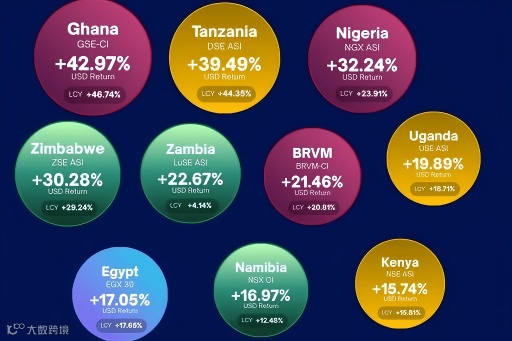 2026年一季度,加纳证券交易所以43%涨幅领跑非洲市场,坦桑尼亚、尼日利亚和津巴布韦美元计价收益均超30%。本轮行情主要受美元走弱及非洲多国货币企稳推动。尼日利亚奈拉本季度对美元升值逾7%,成为全球表现第二佳货币。通胀回落促使各国央行下调利率,资金逐步转向股市提升市场活跃度。
