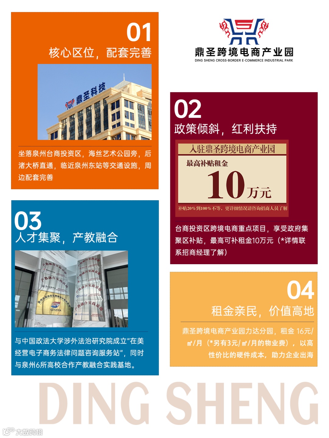 鼎圣跨境电商产业园秉持"服务全程,助力爆单"使命,深度整合跨境全链条资源,提供平台对接、服务商网络搭建、企业/人才孵化及政策申报等一站式服务,支持企业稳占市场并实现全球化发展。