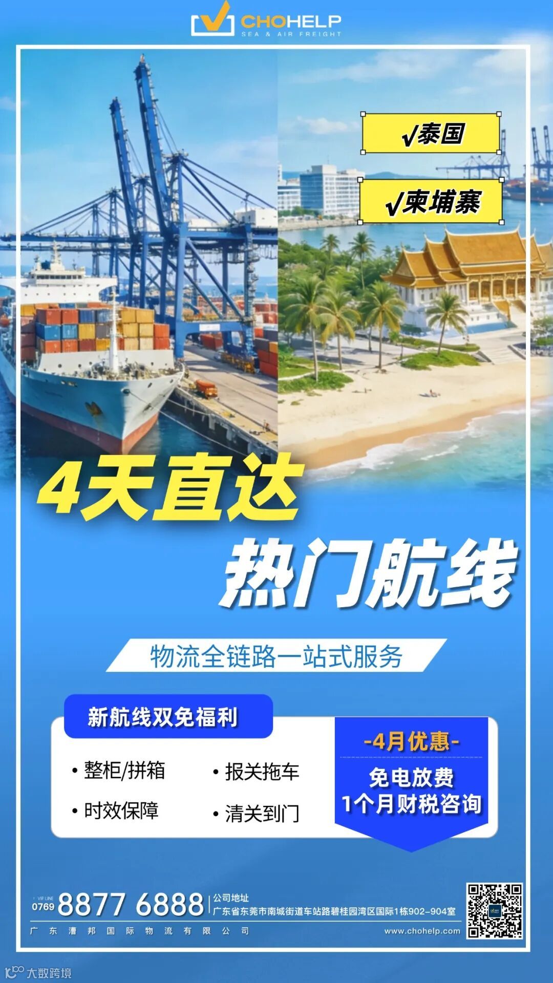 4月东南亚航线“一舱难求”,CCT3作为新开精品快线,凭借4天直航、6截7开、舱稳价优的特点,成为华南出口泰国、柬埔寨的最优选择。