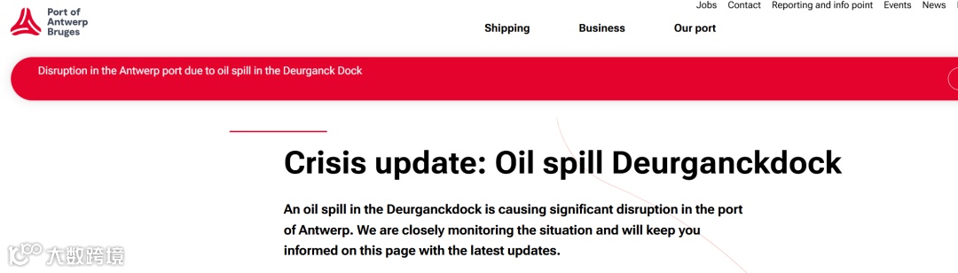 安特卫普-布鲁日港公告:德甘克多克码头漏油事故造成港口运营严重中断,已暂停Deurganckdok码头作业,具体恢复时间待通知。