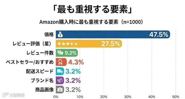 日本机构2026年2月对1000名亚马逊用户的调查显示,约半数消费者将价格列为决策核心因素,评论评分与数量紧随其后。