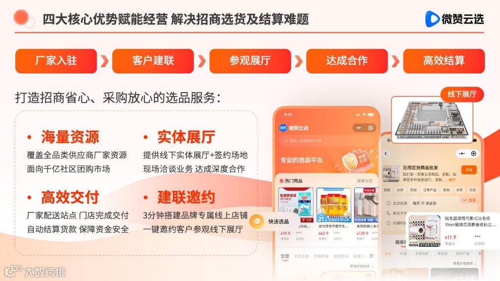 面向私域直播行业的一站式选品-发货-结算服务平台,整合线上云选商城、线下选品展厅及专业场地资源。