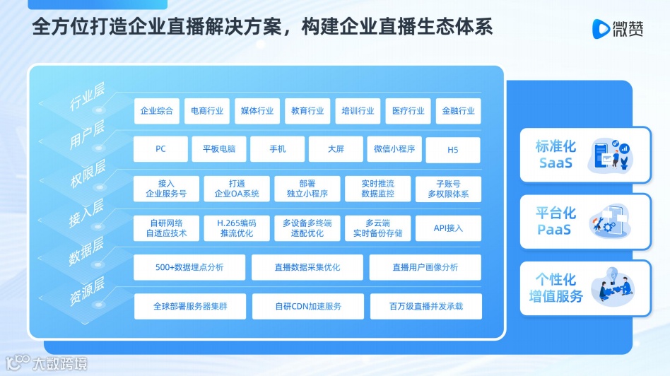 创立于2015年,微赞直播是专业的私域直播服务提供商,连续多年位列中国企业直播服务市场第一梯队。历经10年技术沉淀,已服务超100万家企业客户,保障超1000万场专业直播,覆盖6亿以上终端用户,技术研发投入占比达70%。