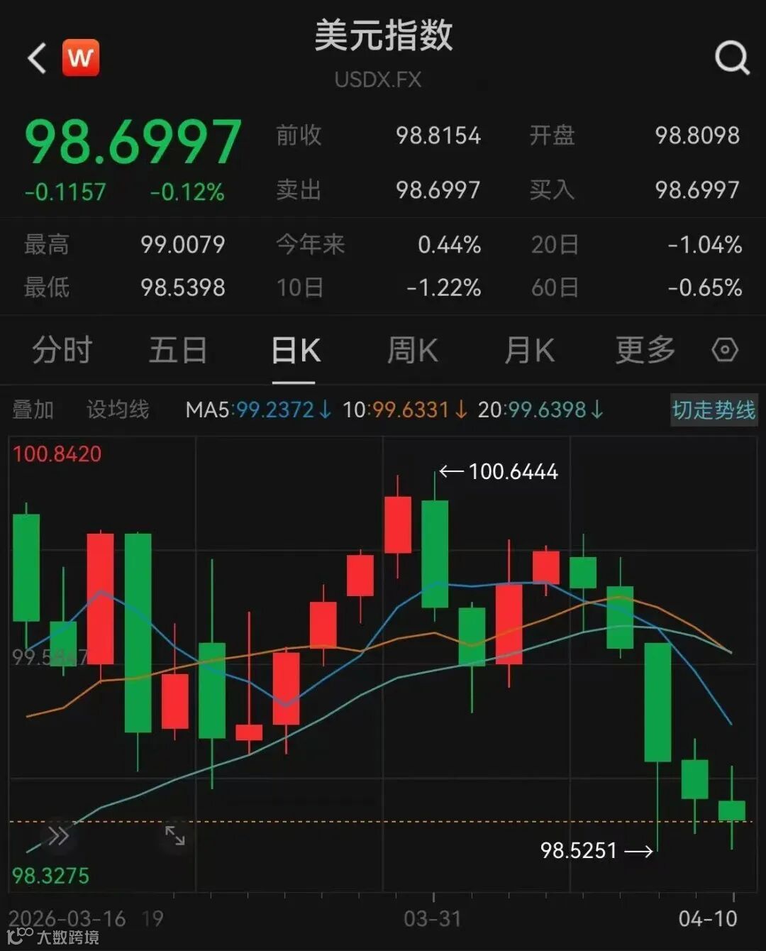 最新动态(截至4月11日中午):谈判当日正式启动,但双方仍互放狠话。市场提前反应利好,美元指数连续五日下跌至98.70,创1月以来最大单周跌幅;油价周跌超14%。由于首日可能采用间接谈判形式,实际进展或慢于预期,市场不确定性犹存。