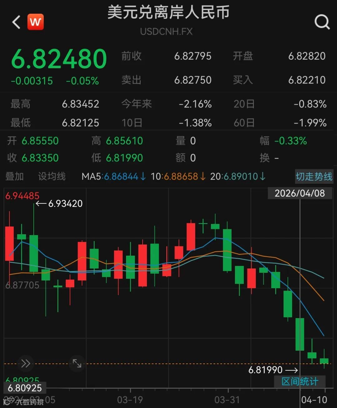 人民币展现出超预期韧性:停火消息推动在岸人民币升至6.8199,创2023年4月以来新高;中间价两日累计上调约300基点。其走强源于美元走弱、宏观经济良好开局吸引资金流入及季节性结汇需求释放三重因素共振。