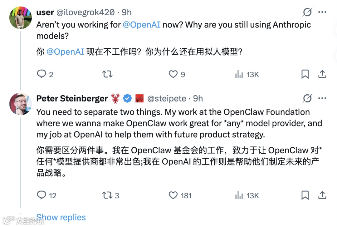 Peter强调其工作内容包括确保OpenClaw兼容多模型提供商,并参与OpenAI产品战略制定。此双重角色引发关于企业边界的讨论。