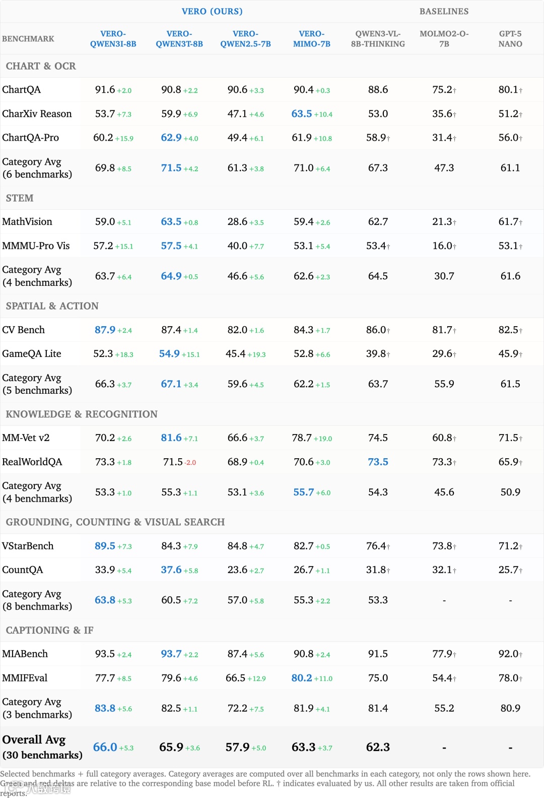 仅需高质量数据过滤、均衡任务混合与精准路由奖励,单阶段RL即可激发基础模型的通用视觉推理能力。实测显示,Vero训练的模型在30项基准测试中,有23项超越专有微调的Qwen3-VL-8B模型。